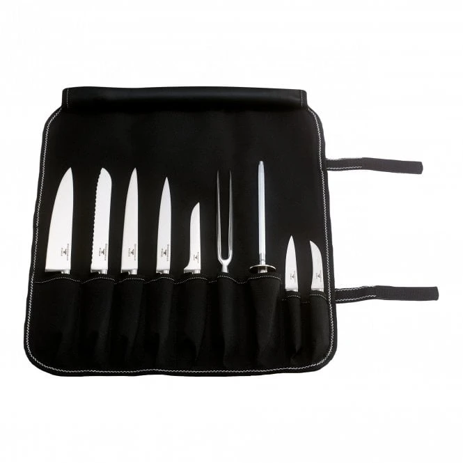 The set consists of: 20cm Chefs knife, 20cm Bread knife, 20cm Slicer, 18cm Fileting Knife, 13cm Boning Knife, 9cm Peeling Knife, 10cm Pairing Knife, Fork and a sharpening steel with a soft roll case.