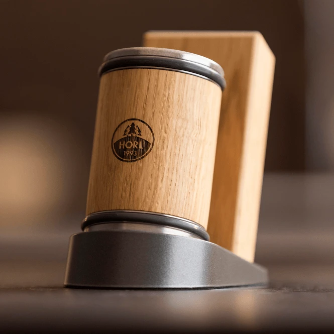 The HORL® Dock adds a sense of sophistication to any kitchen with its sleek metallic appearance and minimalist design. Its graphite finish provides a stylish contrast to the oak and walnut cases of HORL®2 sharpeners.Â