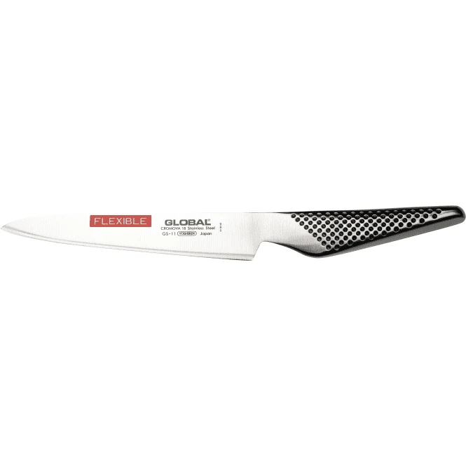 The GS-11 is one of the more popular knives in the Global range and is frequently found in many of the sets where it fills the role of filleting, carving and ‘general purpose’ knife, hence its name. The GS-11 has a medium sized blade at 11cm which is good for filleting small fish such as sea bass. The blade is also flexible which makes it suitable for this purpose.Â
