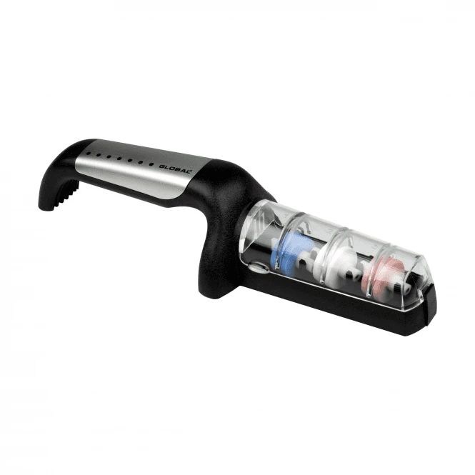 Global Silver & Black 3 Wheel Sharpener. These pull-through sharpeners work in the same way as the Minosharp sharpeners but are branded to match Global Knives. Simply wet the wheels and run your Global knife through the three slots which contain fine, medium and rough stone wheels to sharpen the edge of your knives. Comes in black & stainless-steel finish.