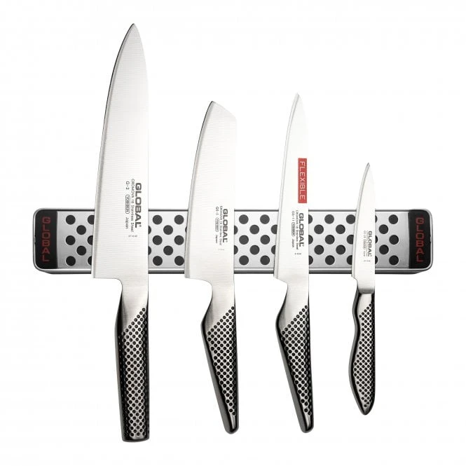Each knife in this collection features Global’s iconic all-metal aesthetic, crafted from high-carbon steel that is ice-tempered and hardened to a Rockwell C56-58. The set is beautifully presented on a 30cm Global-branded magnetic rack, allowing you to showcase your professional tools while keeping them within easy reach.