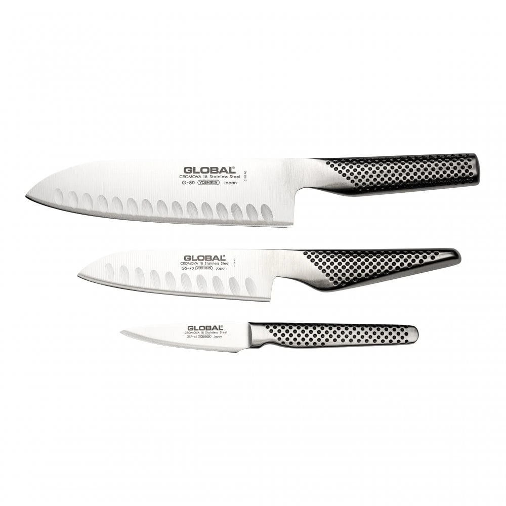 Set Consists of: G-80 18cm Fluted Santoku Knife, GS-90 13cm Fluted Santoku Knife, GSF-46 8cm Peeling Knife