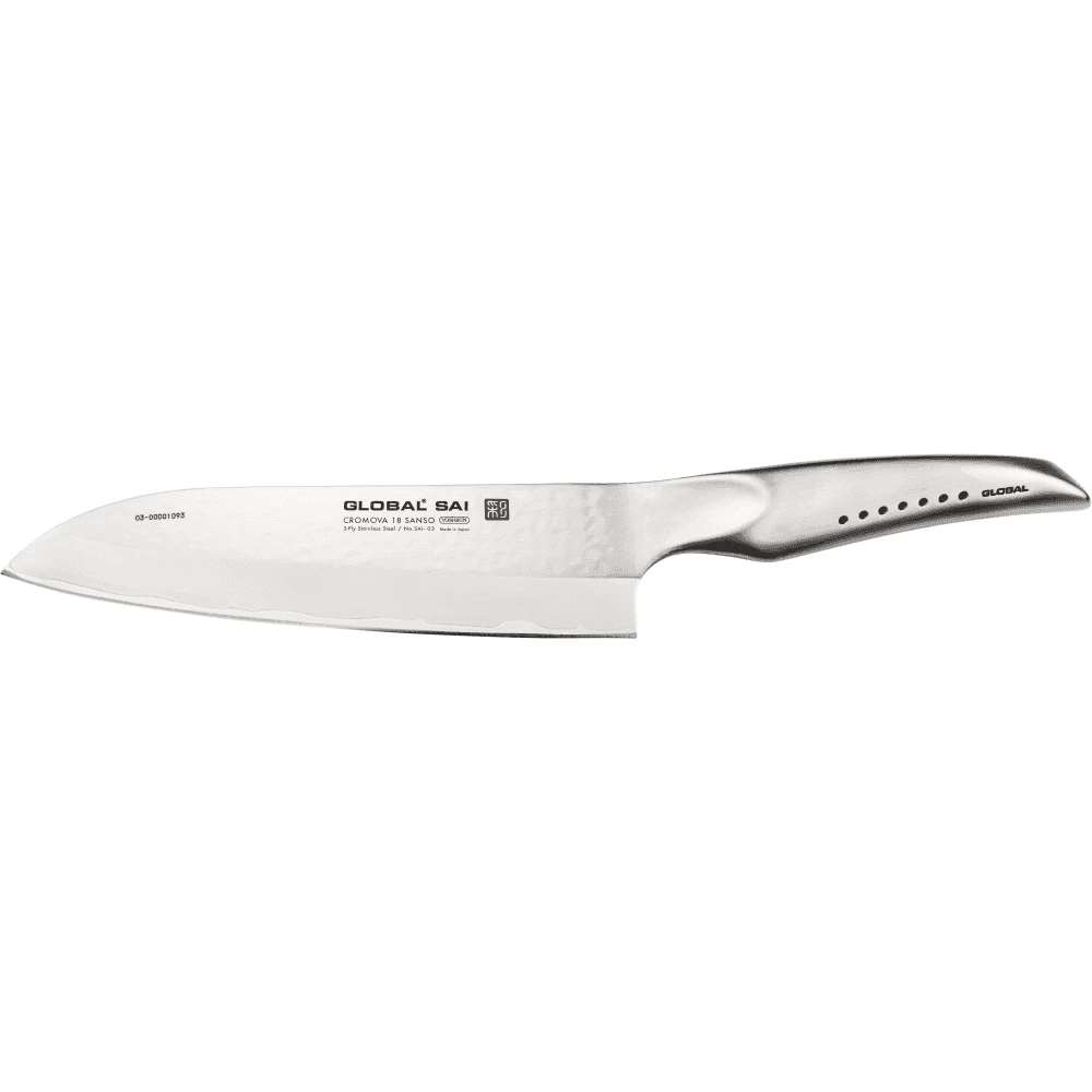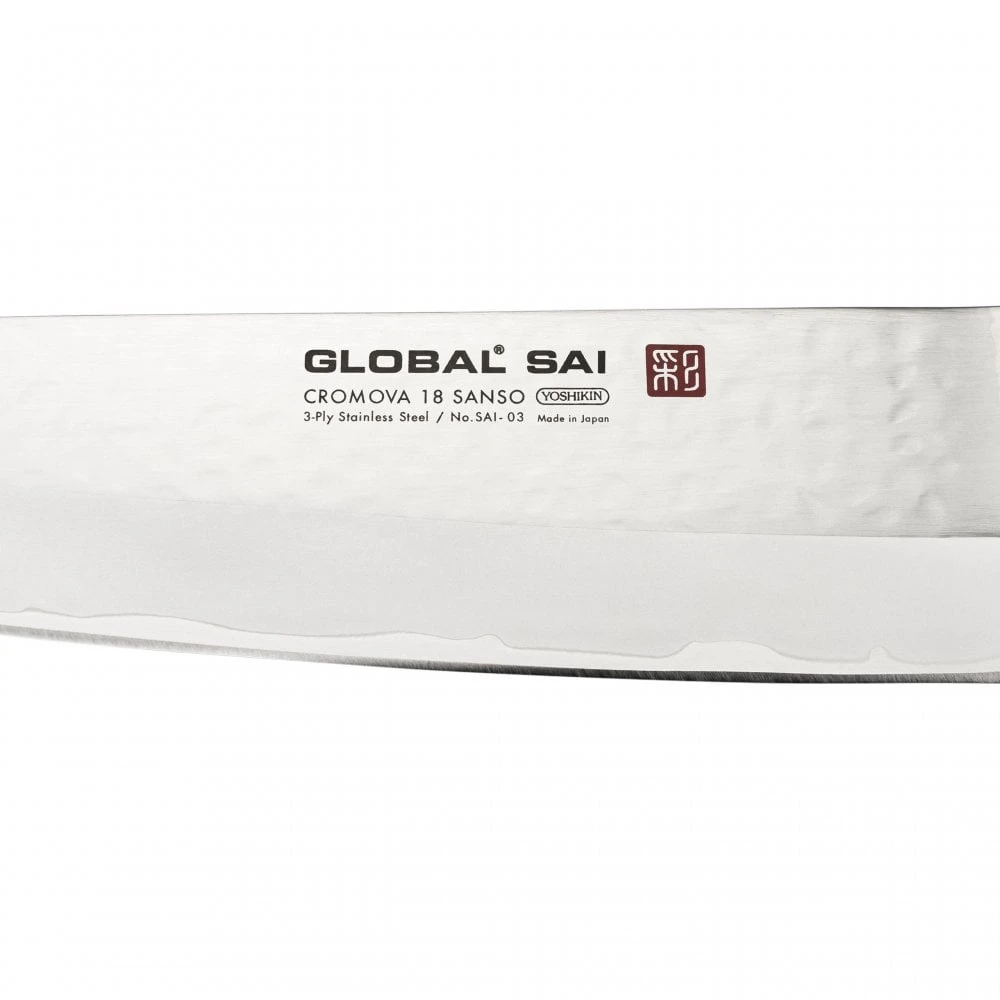 The Global SAI Santoku knife is a really big powerful knife suited for the 3 ways of Sanoku, slicing, dicing and mincing. The SAI-03 is one of the heavist Santoku knives in the Global range. It is really good for chopping vegetables as it has quite a flat profile, but can be used as well for slicing meat. As the knife is so heavy it is a lot stronger than standard Global knives and will take a lot of punishment. A smaller version of the Santoku knife is available as the SAI-M03, at 13.5cm is brilliant for smaller veg.