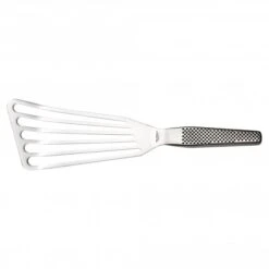 The biggest of the Global spatula range, the GS-27 has a large fanned blade with holes in, which makes this spatula particularly good fro cooking with larger items that are either greasy or tend to fall apart like whole fish. The slanted edge gives a good angle to section of slices or push away grease.