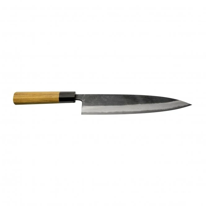 Absolutely Gorgeous! That’s how we would describe the Hatsukokoro Kumakage Blue 2 with Kurouchi and Damascus finish knives. When being unboxed, you can really see where the range gets its name from “Cloud Shadow “. Looking at the blade the soft Iron cladding with the Kurouchi finish is then hand sharpened to show a beautifully polished Damascus finish under the Iron cladding to then expose the Blue 2 steel core. When looking intently at the blade the contrast of the Iron cladding against the Damascus and Blue 2 steel edge almost looks as if you are looking up at a cloudy sky which is broken by patches of dark and light clouds. Having the core of Blue 2 steel it should be known that whilst this is one of the most premium quality steel cores available on the market but there is a high carbon content which makes them reactive. A little bit of TLC is all that is required with a few drops of camellia oil to keep the reactive blade in a protective coating. The edge gives an HRC of 62-63 and the handle is octagonal in teak with a black buffalo horn bolster.