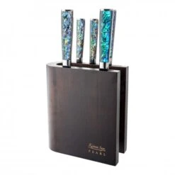 The Katana Saya Pearl collection captures the enchanting essence of nature with a mesmerizing iridescent handle design inspired by the abalone shell, known locally as ‘Paua.’ Celebrated for its strength, durability, and symbolic connection to peace, compassion, and love, this unique material adds a stunning touch to each knife. The ergonomically designed handles provide a well-balanced, comfortable grip, making every cut effortless. Paired with razor-sharp Japanese VG-10 Damascus steel blades, these knives deliver exceptional cutting performance, ensuring precision and durability for years to come. Elegant, resilient, and one of a kind—just like nature itself.