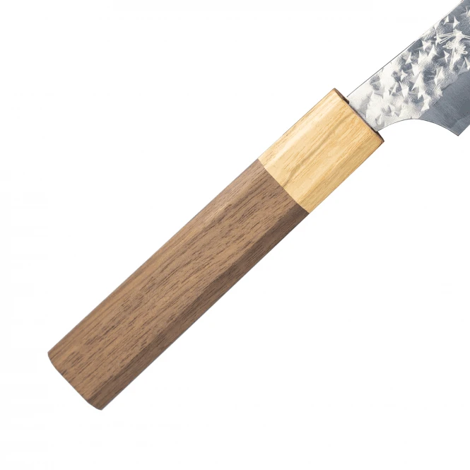 The traditional Japanese knife construction is evident in the Senkoei range. The knives feature an octagonal handle meticulously crafted from Walnut wood. This choice of handle material not only provides a comfortable grip but also adds a touch of natural beauty to the overall design. The handle shape is ergonomically designed to ensure a secure and balanced hold, allowing for precise control and manoeuvrability during use.