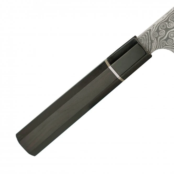 The handle of the Nigara Hamono knife is crafted from beautiful octagonal teak, offering a comfortable grip and a visually pleasing aesthetic. The handle is further enhanced by a black buffalo horn bolster and a silver spacer, adding a touch of elegance to the overall design. This combination of materials not only provides a secure grip but also adds to the knife’s overall balance and manoeuvrability.