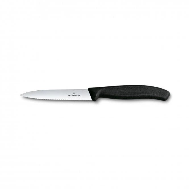 Swiss Classic Paring Knife, 10cm, Wavy Edge, Pointed Tip, Black Precision Knife for Cutting, Coring, and Slicing The Swiss Classic Paring Knife features a 10cm wavy-edged blade with a pointed tip, designed to handle a variety of kitchen tasks with ease. Its ultra-sharp edge effortlessly slices through thick peels and tough skins, while the pointed tip allows for precision coring, seed removal, and detailed trimming. Crafted in Switzerland from high-quality stainless steel, this knife boasts an ergonomic black handle for optimal comfort and control, making it the perfect tool for intricate food preparation. Ideal for vegetables, fruits, and delicate ingredients, it ensures smooth, uniform cuts every time, turning your ingredients into beautifully prepared dishes.