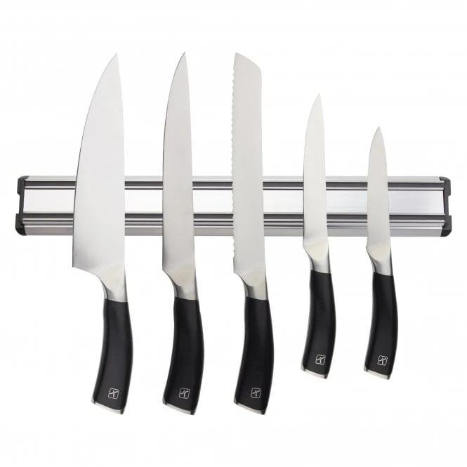 Lavish and practical, this knife rack allows the user easy access to their knives during food prep whilst having them on show. The set contains: Chef Knife, Carving Knife, Bread Knife, Utility Knife & Paring Knife.