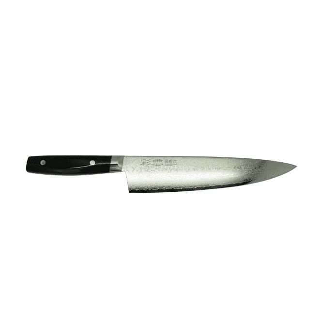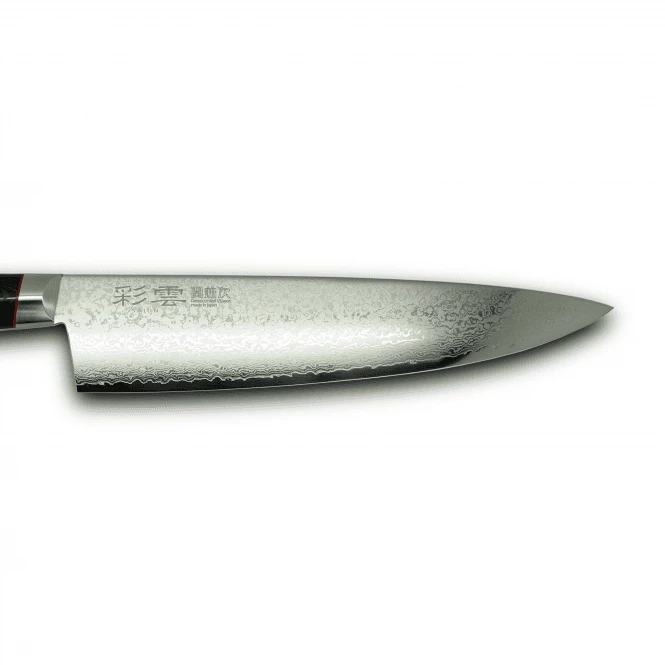 The Saiun series features a breathtaking 65-layer Damascus blade. At its heart lies a VG10 steel core with 1% carbon content, providing extreme hardness for long-lasting sharpness. This core is meticulously encased in 32 layers of softer steel on each side, creating a unique wavy pattern that ensures no two blades are exactly alike. The “Hamaguri-ba” (convex) edge, inspired by traditional Samurai swords, allows for effortless, precise straight cuts through any ingredient.