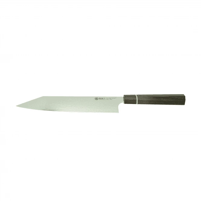 In honour of our centenary, the “Zuiun” series is meticulously crafted from R2/SG2 high-speed powdered core steel, heat-treated, and cold-treated to achieve an impressive hardness rating of 62-63 HRC, ensuring superior edge retention. This represents the pinnacle of Kanetsugu’s craftsmanship, with a stunning Damascus cladding that exhibits a near-mirror finish.