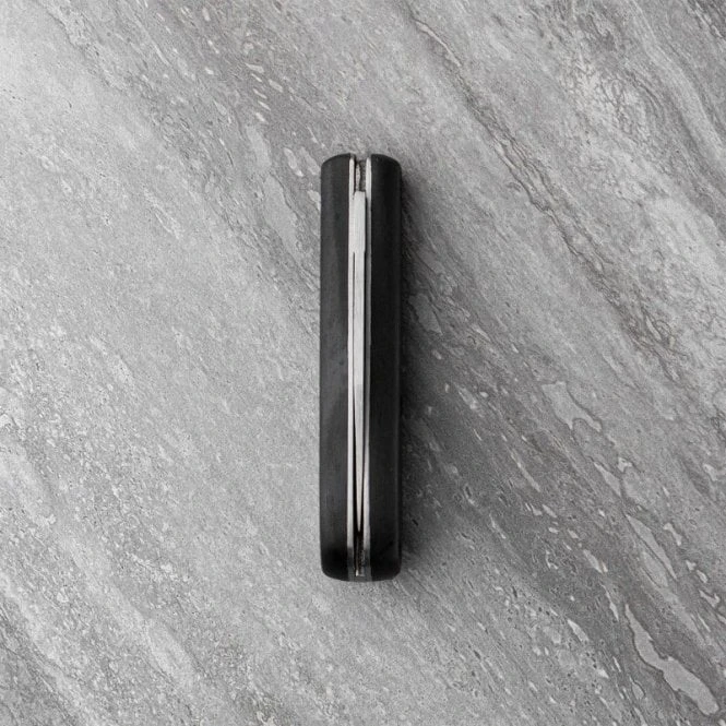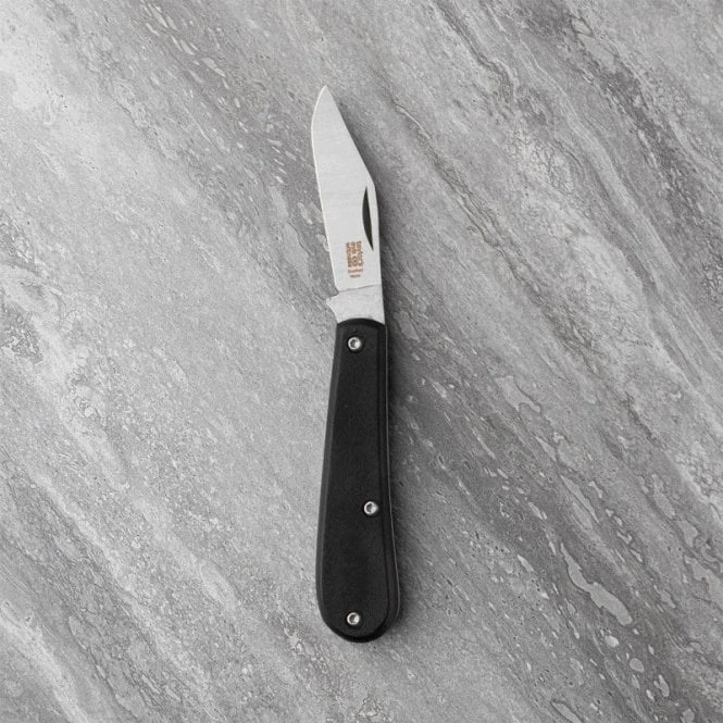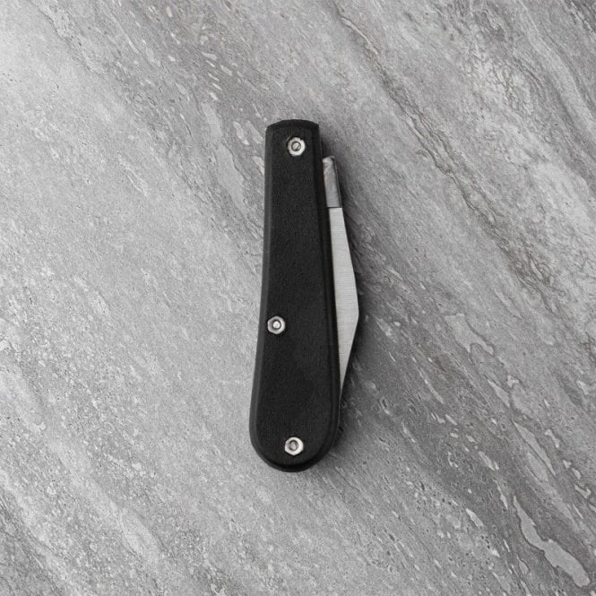 This knife features a striking black fibre-feel resin handle, secured with a distinct triple-bolt locking system for maximum structural integrity and a non-slip ergonomic grip. The 5.7cm clip point blade is crafted from high-grade 420H stainless steel, offering a satin finish that resists corrosion while maintaining a razor-sharp edge for precision tasks.