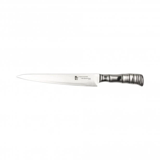 The word Tamahagane means precious steel. Historically, the word Tamahagane has been known as a particular, very pure and high quality steel produced using traditional Japanese techniques. The Kataoka factory in Niigata Japan uses Tamahagane as its brand name, making exceptional knives that are unsurpassed in sharpness and edge retention. Our Tamahagane Knives are all made with a 3 ply stainless steel constuction. The middle layer is VG-5 which forms the edge of the blade. This layer is exceptionally hard (61 HRC), it is as hard as VG-10 stainless steel but has superior edge retention. The two outer layers are made of SUS-410 stainless steel, which is softer and more stain resistant in order to protect the cutting edge. In all the knife blade material is rolled and thinned to a thickness of just 2mm. Tamahagane Bamboo knives are given a bevelled edge of around 15 degrees, giving an incredibly sharp finish. The knives are finished with a hollow stainless steel handles weighted to perfection. All Tamahagane knives are covered by the manufacturers guarantee against faults and defects.