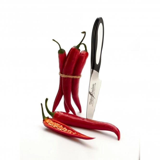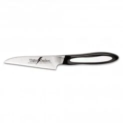 This knife is something between a paring, utility and chef’s knife. It has a really flat blade edge which makes it good for getting clean cuts through fruit and veg.Â