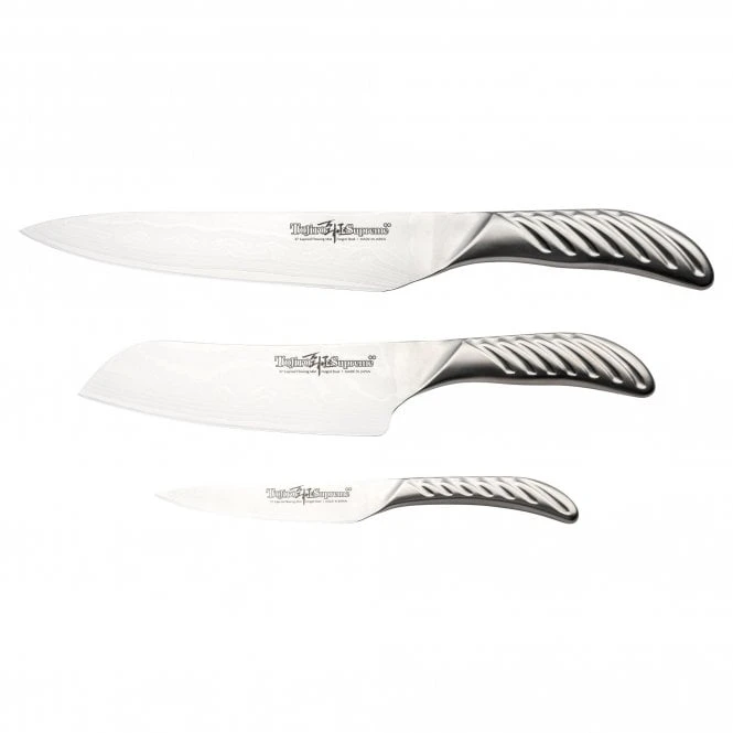 These knives are made out of the finest 37 layer Damascus steel wrapped around a VG-10 core to provide a very hard cutting edge (Rockwell 60-62). The handles are made from a hollow stainless steel that is comfortable to use.