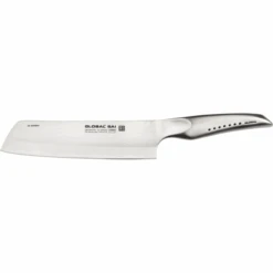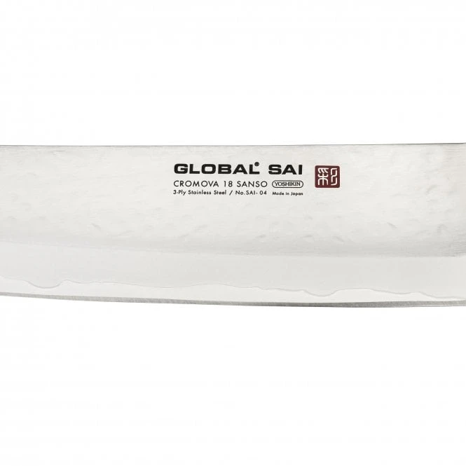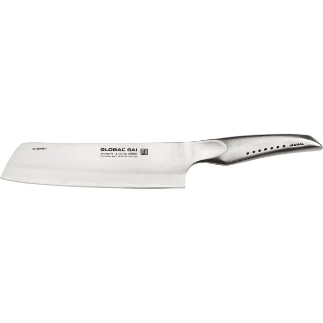 Global SAI has two vegetable knvies in its range. The SAI-04 is a specialist vegetable chopping knife. It has a long flat blade designed to get a clean cut when the knife cuts down onto the board. It is quite a heavy knife and suitable for long hours in the kitchen. With its long 19cm blade and the stretched handle of the SAI series, the SAI-04 knife is the largest vegetable chopper Global produce. It has a smaller brother the SAI-M06, which home users will find a bit more manageable as it has only a 15cm length. This makes it more similar to the popular G-5